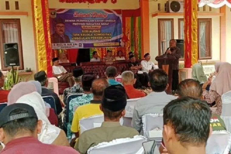 salingkanews.com – Anggota Komisi IV DPRD Provinsi Sumatera Barat, Muzli M. Nur mensosialisasikan Perda No.3 Tahun 2023 Tentang Tata Kelola Komoditas Unggulan Perkebunan dan Pertanian di halaman Kantor Wali Nagari Tanjung Baringin, Lubuk Sikaping, Minggu (24/8).